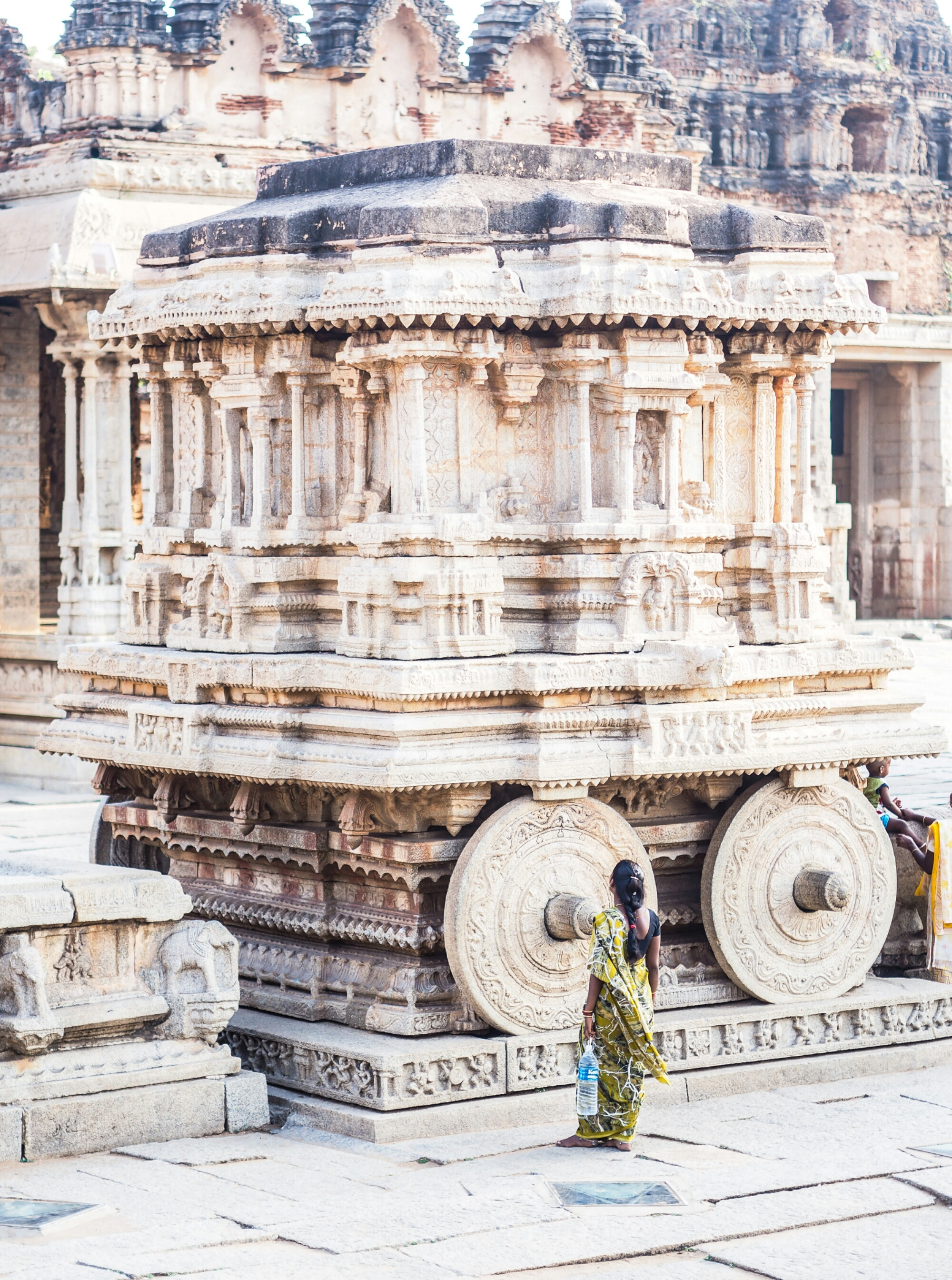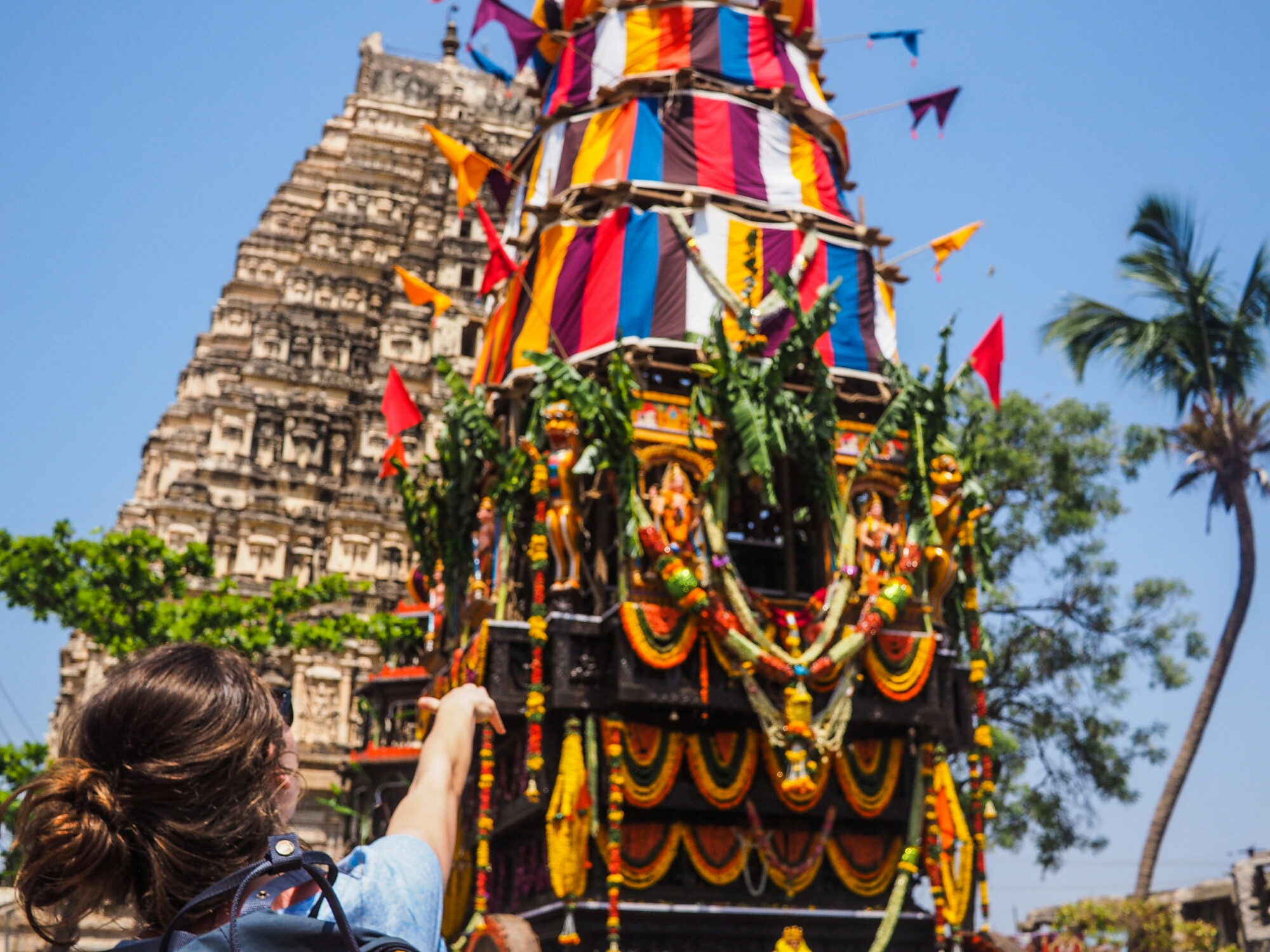 Niet wetend dat deze maanden overspoeld zijn met festivals prezen we ons gelukkig dat we juist nu, op 3 april, in Hampi waren neergestreken. Het Hindoeïsme, zonder twijfel het meest polytheistische geloof dat ik ken, viert met het festival de bruiloft van een van de goden. Twee reusachtige wagens werden langzaam met man en macht over de bazaar getrokken. De omstanders gooiden vol overgave bananen richting de rijdende tempels. Welkom in India.