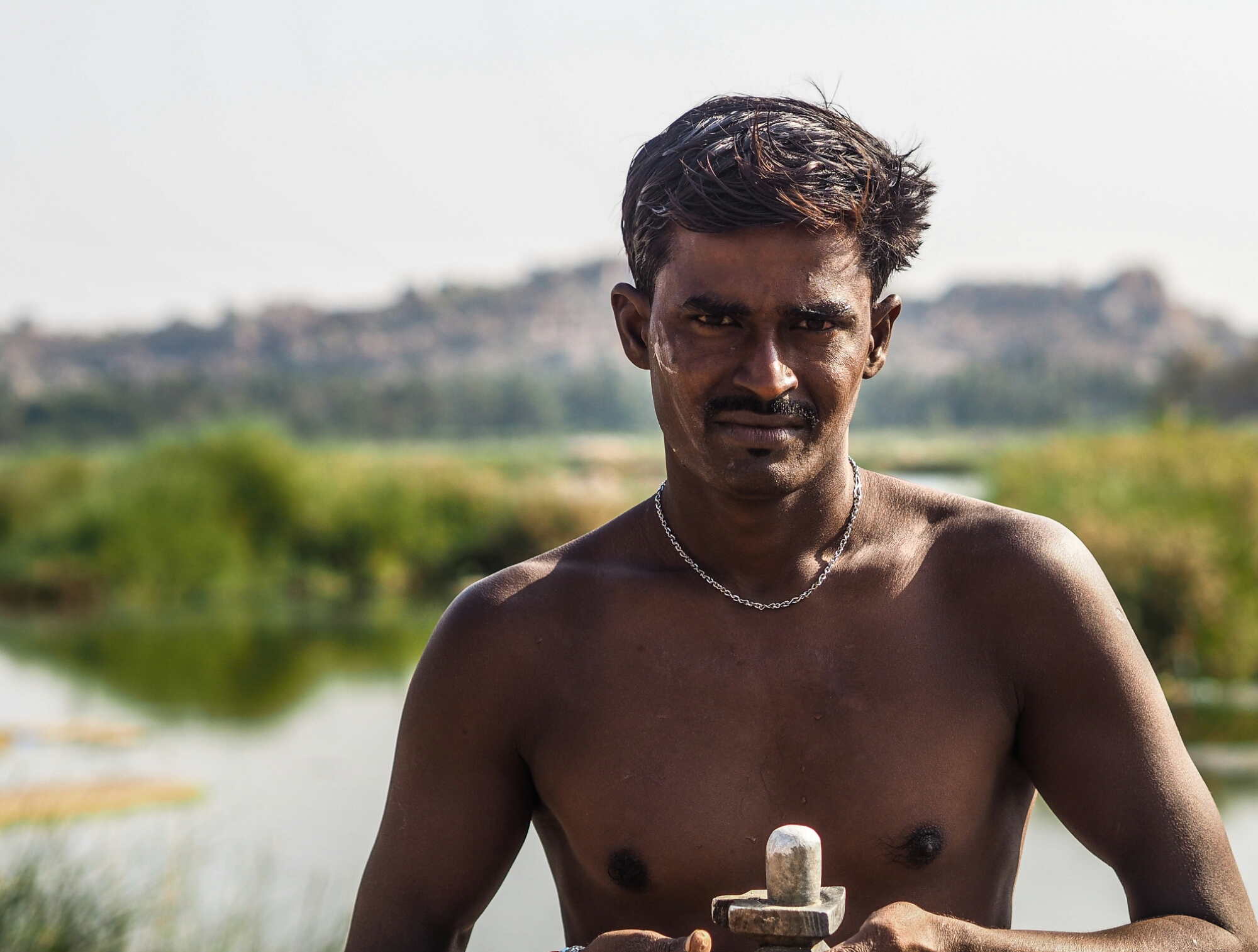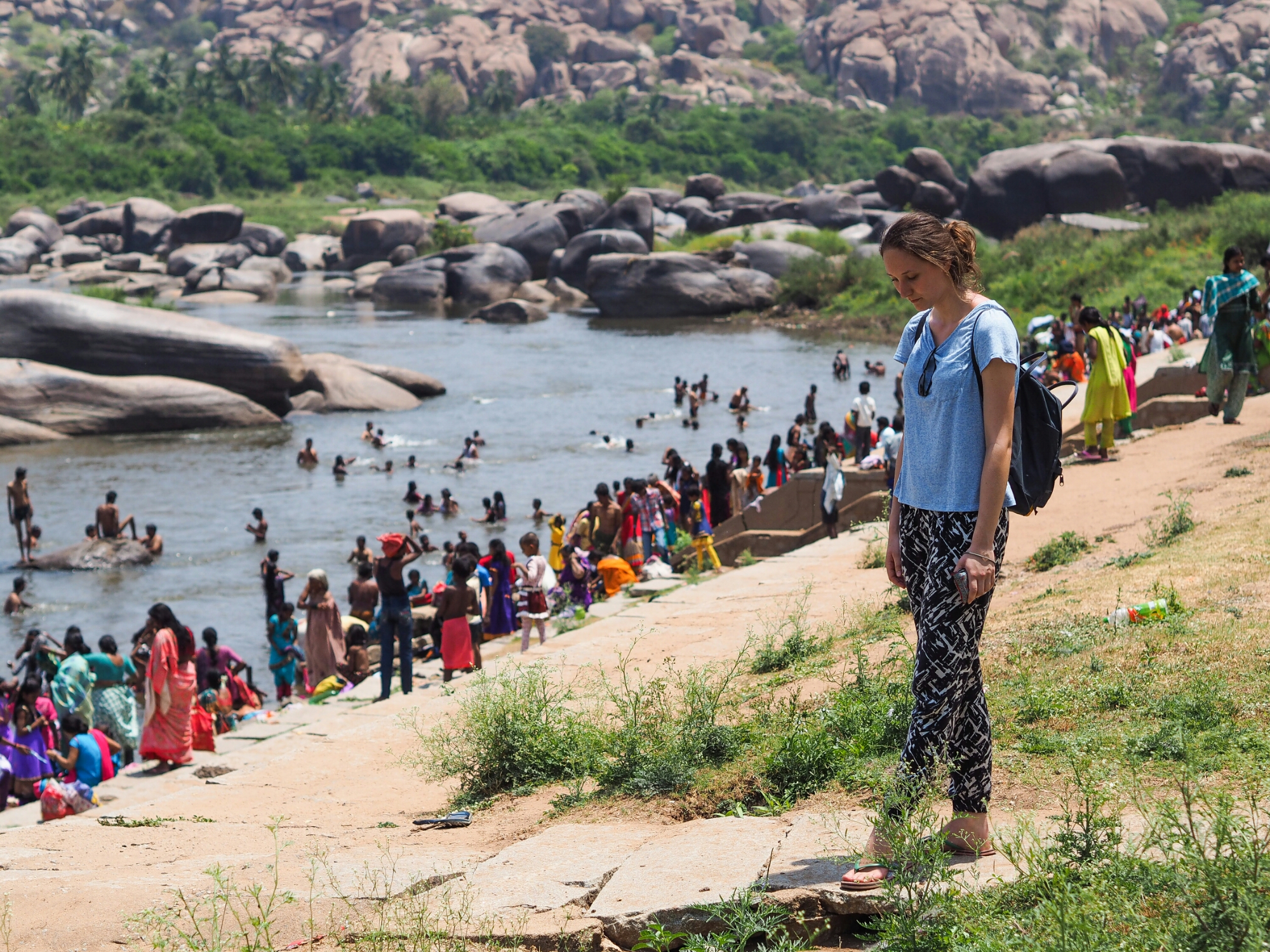 Enfin, de dag na de tempels pakten we onze backpacks en trokken we Hampi uit om de rivier over te steken. Op het heetst van de dag stonden er zeker 200 Indiërs in het water. Privacy bestaat niet in het land van 1.2 miljard. Er werd gelachen, gespeeld, gewassen en vooral afgekoeld. Twintig meter verderop zat een vrouw op haar hurken te poepen.